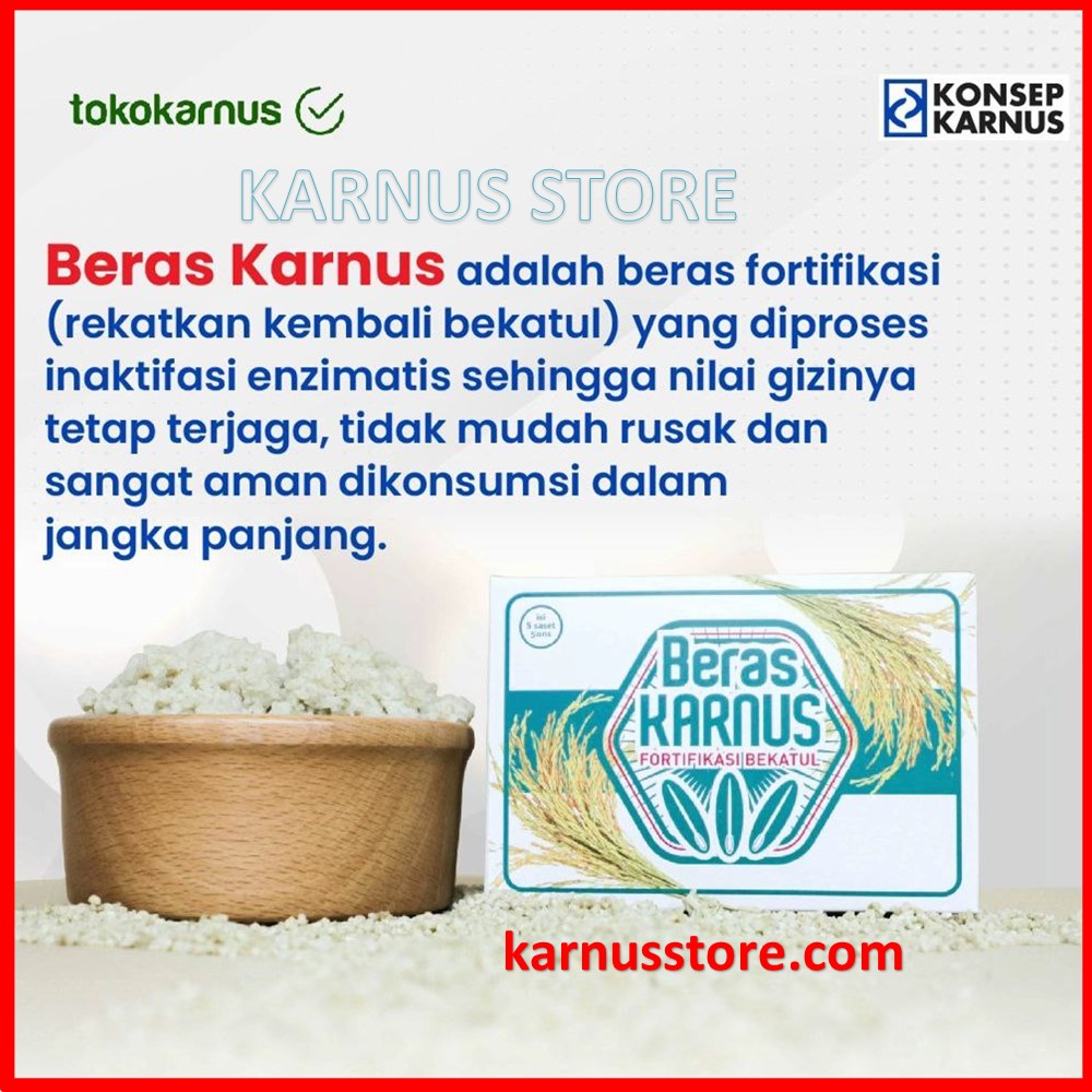 Karnusstore.com – Beras Karnus adalah beras yang telah difortifikasi atau diperkaya dengan bekatul dan dirancang khusus seseuai dengan Konsep Karnus. Terbuat dari beras pilihan yang berkualitas dan bekatul yang telah diproses inaktifasi enzimatis sehingga nilai gizinya tetap terjaga, tidak mudah rusak